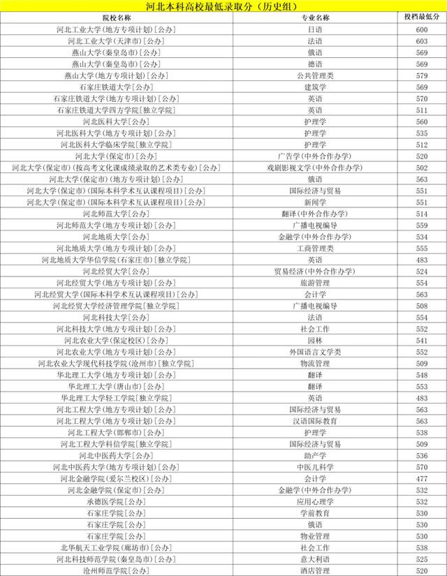 河北本科高校最低录取分(历史组)
