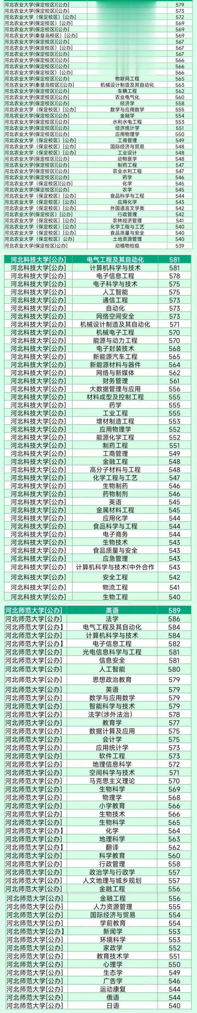 河北医大最高分是629分的临床医学(5+3),临床医学一向是医学大类里分数比较高的,尤其是这种本硕连读的,更是分数高很多,因为临床医学没个硕士傍身基本上没法就业;最低是553分的健康服务与管理。河北大学最高分是599分的计算机科学与技术;最低分是545分的护理学,护理学一般是医学大类里录取分数比较低的专业,即使是北大的护理学也是一样。河北农大最高分是579分的电气工程与自动化;最低是539分的动物检验检疫。河北科大最高分也是581分的电气工程与自动化,最低分是540分的生物工程。