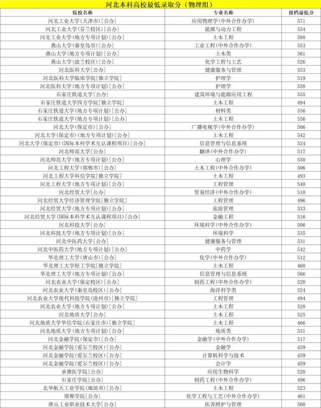 河北本科高校最低录取分(物理组)